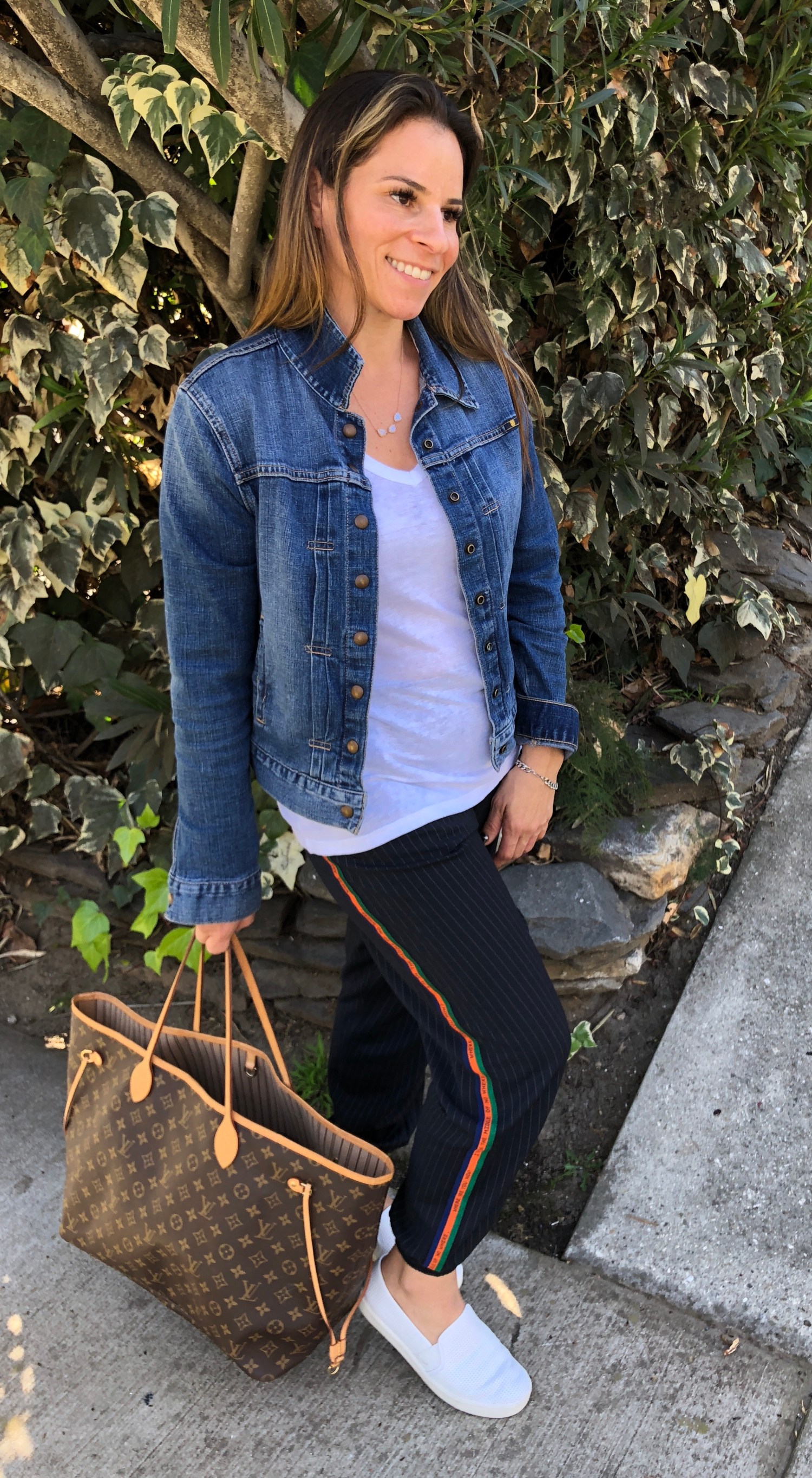 I am just loving the track pant trend and it definitely isn’t because they are great for exercising in. I am all about comfort and ease; clothes that don’t restrict me from getting down on the ground and playing with my kids. I love clothes that are versatile. I can wear them day and night. I can wear them running around doing carpool and schlepping to and from sports practices but also wear them for a work meeting or really dress them up for a night out. The track pant is all of these things. They are the right amount of sophistication and casual. During the day I wear my go-to slip-on sneakers but at night, I love pairing them with an elegant and dainty heel. The dichotomy of the two is what really makes this trend work; combining the femininity of a pointed-toe heel with the &&& (sturdiness) of an exercise-themed pant.